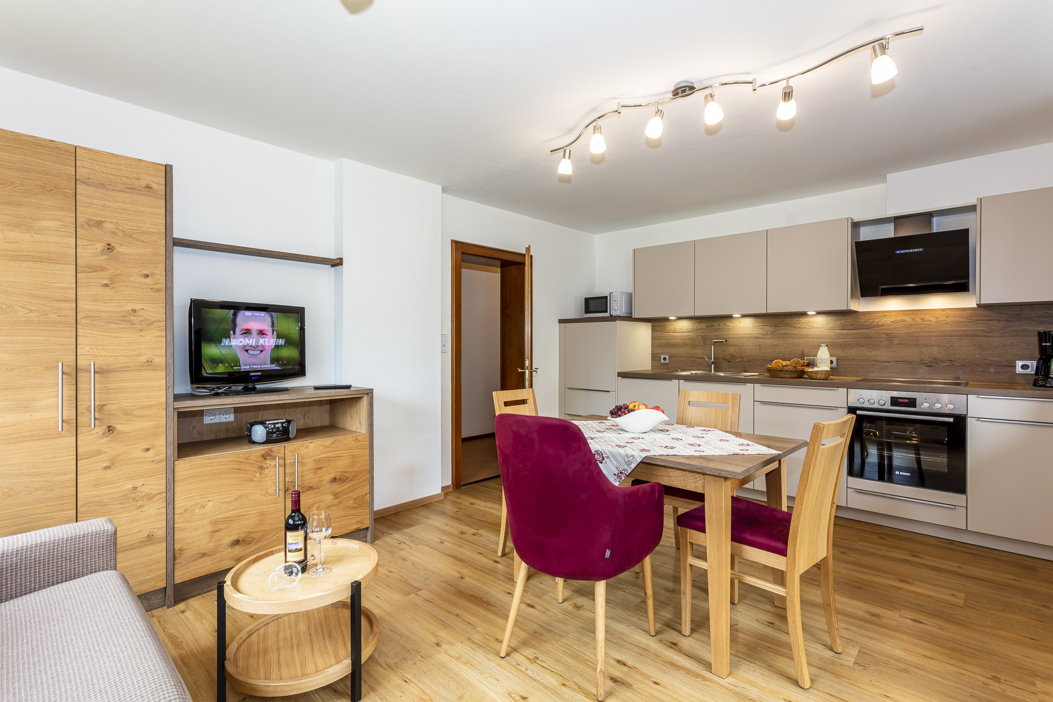 Ab Sommer 2022 Neue Wohn-Küche mit Geschirrspüler, Koch-Ceranfeld mit Backrohr, Kühlschrank mit Gefrierfach, Kaffeemaschine und Eierkocher.