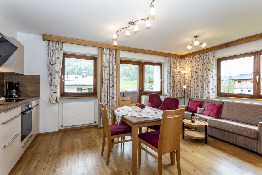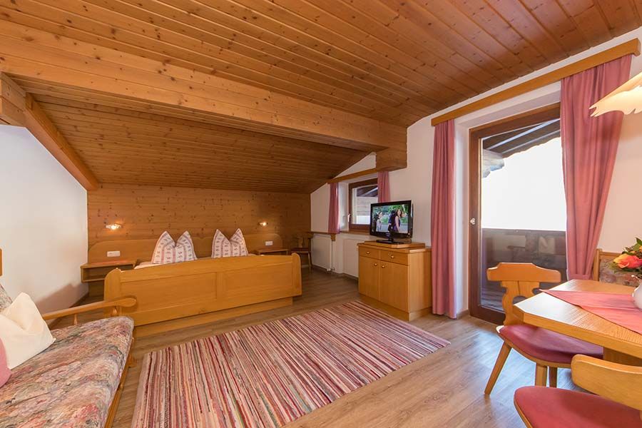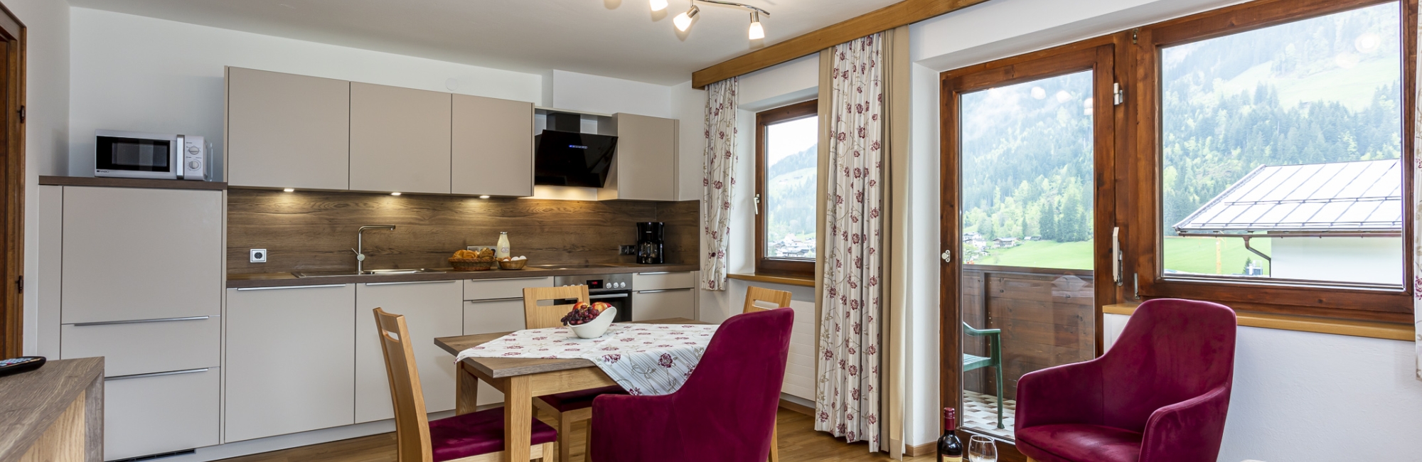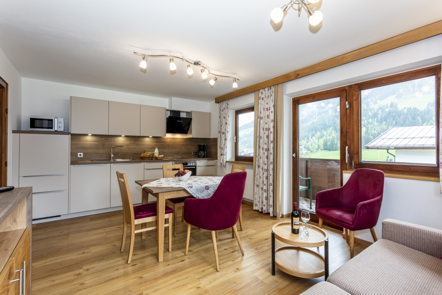 Unsere geräumige und gemütlich eingerichtete Ferienwohnung "Steinberg" auf unserem Bauernhof in St. Jakob in Haus im schönen Pillerseetal bietet Platz für bis zu 4 Personen. Während sich die herrliche Terrasse mit Blick auf die umliegenden Wiesen und das Jakobskreuz hervorragend zum Frühstücken eignet, genießen Sie am großen Balkon die Abendsonne und die Aussicht auf das Dorf St. Jakob.